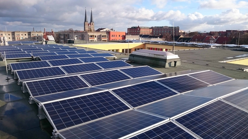 Die Stadtwerke Burg haben eine Photovoltaikanlage auf unserem Schuldach installiert, die zu Sonnenzeiten unseren Energiebedarf vollständig decken kann. Der überschüssige Strom wird in das Stromnetz eingespeist.
